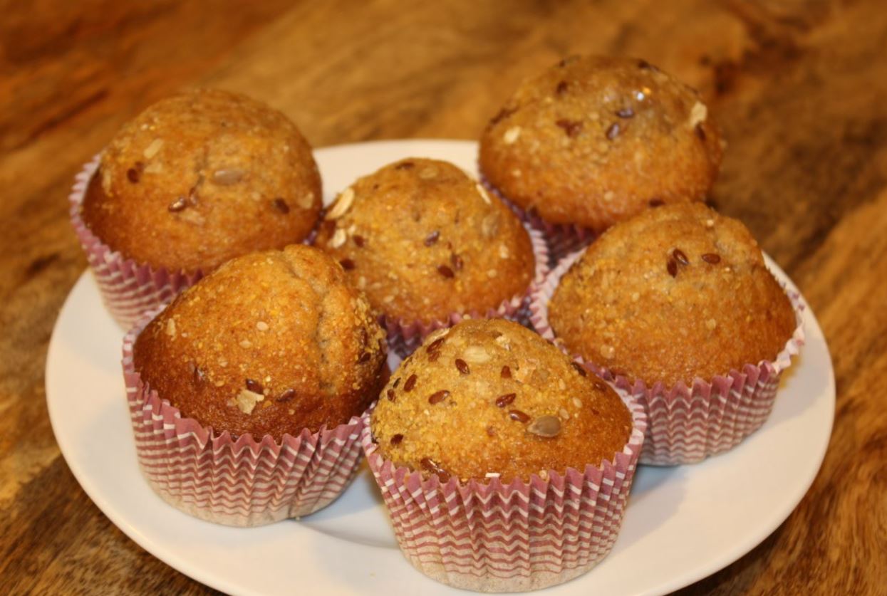 Deliciosas magdalenas elaboradas con harina integral de trigo y aroma natural a cítricos decoradas con crujientes copos de avena, semolina de maíz, pipas de girasol, copos de trigo, ajonjolí y cáscara de soja.