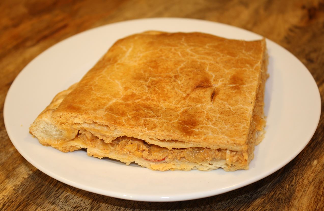 Empanada de atún con cebolla y pimientos, con masa tradicional de pan.